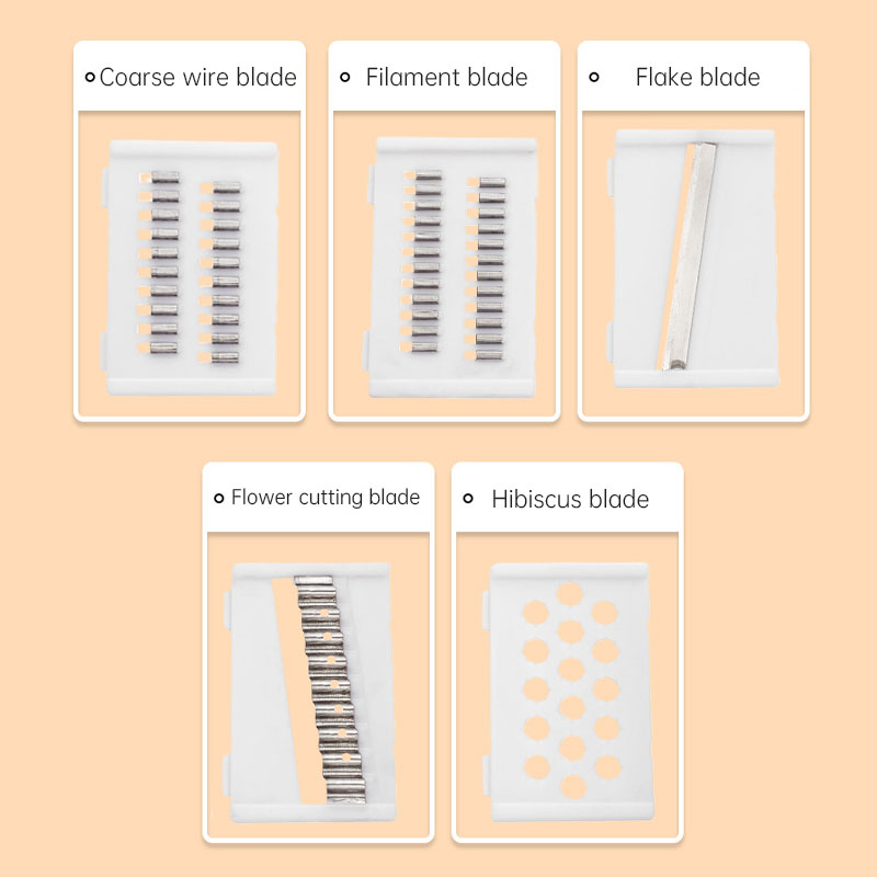 - Cutter body + 5 Knives + Hand-guard + Small peeler